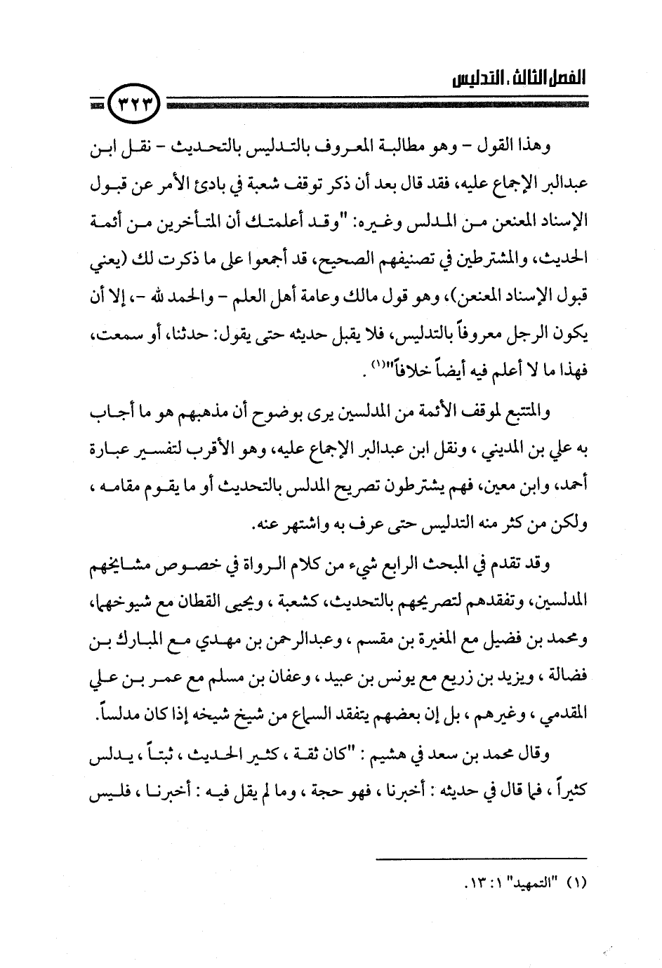 وهذا القول - وهو مطالبة المعروف بالتدليس بالتحديث - نقل ابن عبدالبر الإجماع عليه، فقد قال بعد أن ذكر توقف شعبة في بادئ الأمر عن قبول الإسناد المعنعن من المدلس وغيره: "وقد أعلمتك أن المتأخرين من أئمة الحديث، والمشترطين في تصنيفهم الصحيح، قد أجمعوا على ما ذكرت لك (يعني قبول الإسناد المعنعن)، وهو قول مالك وعامة أهل العلم - والحمد لله -، إلا أن يكون الرجل معروفاً بالتدليس، فلا يقبل حديثه حتى يقول: حدثنا، أو سمعت، فهذا ما لا أعلم فيه أيضاً خلافاً" (¬١).