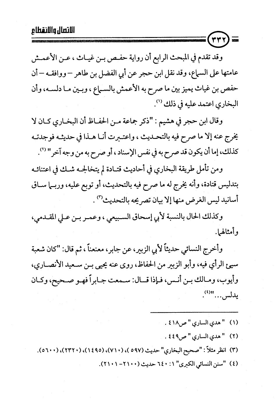 وقال ابن حجر في هشيم: "ذكر جماعة من الحفاظ أن البخاري كان لا يخرج عنه إلا ما صرح فيه بالتحديث، واعتبرت أنا هذا في حديثه فوجدته كذلك، إما أن يكون قد صرح به في نفس الإسناد، أو صرح به من وجه آخر" (¬٢).