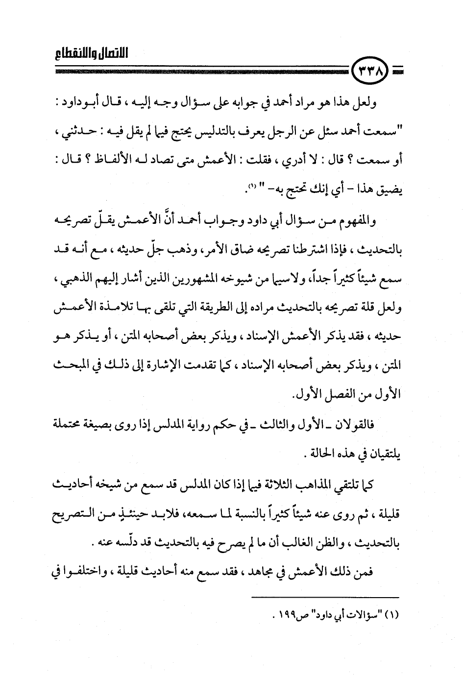 ولعل هذا هو مراد أحمد في جوابه على سؤال وجه إليه، قال أبوداود: "سمعت أحمد سئل عن الرجل يعرف بالتدليس يحتج فيما لم يقل فيه: حدثني، أو سمعت؟ قال: لا أدري، فقلت: الأعمش متى تصاد له الألفاظ؟ قال: يضيق هذا - أي إنك تحتج به- " (¬١).