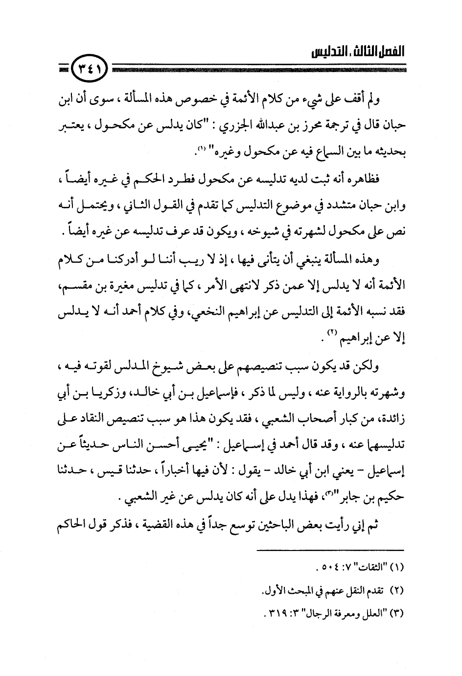 ولم أقف على شيء من كلام الأئمة في خصوص هذه المسألة، سوى أن ابن حبان قال في ترجمة محرز بن عبدالله الجزري: "كان يدلس عن مكحول، يعتبر بحديثه ما بين السماع فيه عن مكحول وغيره" (¬١).