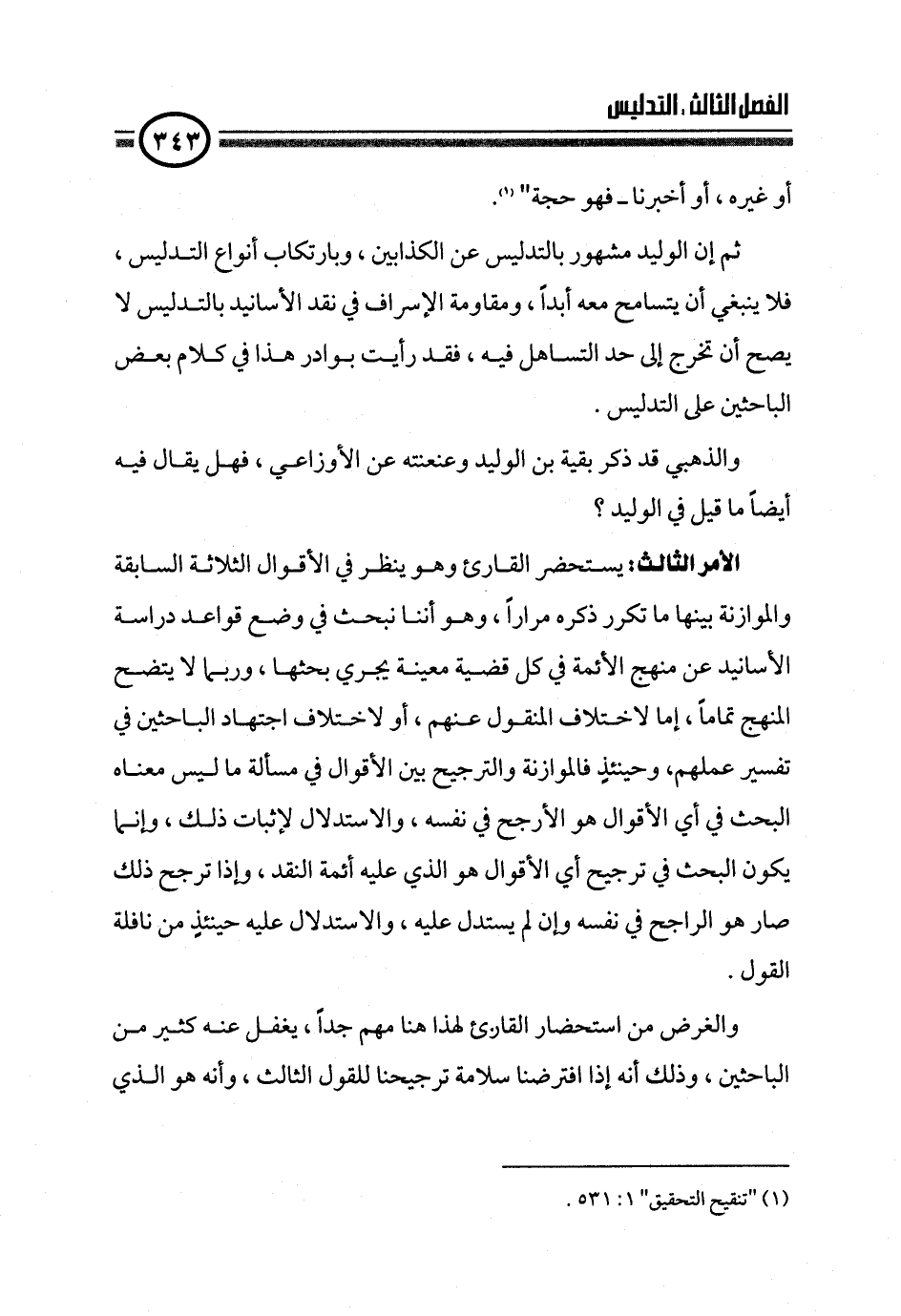 الأمر الثالث: يستحضر القارئ وهو ينظر في الأقوال الثلاثة السابقة والموازنة بينها ما تكرر ذكره مراراً، وهو أننا نبحث في وضع قواعد دراسة الأسانيد عن منهج الأئمة في كل قضية معينة يجري بحثها، وربما لا يتضح المنهج تماماً، إما لاختلاف المنقول عنهم، أو لاختلاف اجتهاد الباحثين في تفسير عملهم، وحينئذٍ فالموازنة والترجيح بين الأقوال في مسألة ما ليس معناه البحث في أي الأقوال هو الأرجح في نفسه، والاستدلال لإثبات ذلك، وإنما يكون البحث في ترجيح أي الأقوال هو الذي عليه أئمة النقد، وإذا ترجح ذلك صار هو الراجح في نفسه وإن لم يستدل عليه، والاستدلال عليه حينئذٍ من نافلة القول.
