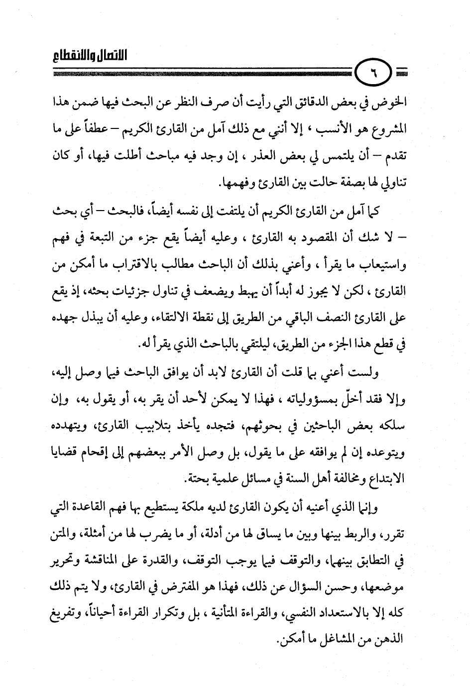 كما آمل من القارئ الكريم أن يلتفت إلى نفسه أيضاً، فالبحث - أي بحث - لا شك أن المقصود به القارئ، وعليه أيضاً يقع جزء من التبعة في فهم واستيعاب ما يقرأ، وأعني بذلك أن الباحث مطالب بالاقتراب ما أمكن من القارئ، لكن لا يجوز له أبداً أن يهبط ويضعف في تناول جزئيات بحثه، إذ يقع على القارئ النصف الباقي من الطريق إلى نقطة الالتقاء، وعليه أن يبذل جهده في قطع هذا الجزء من الطريق، ليلتقي بالباحث الذي يقرأ له.