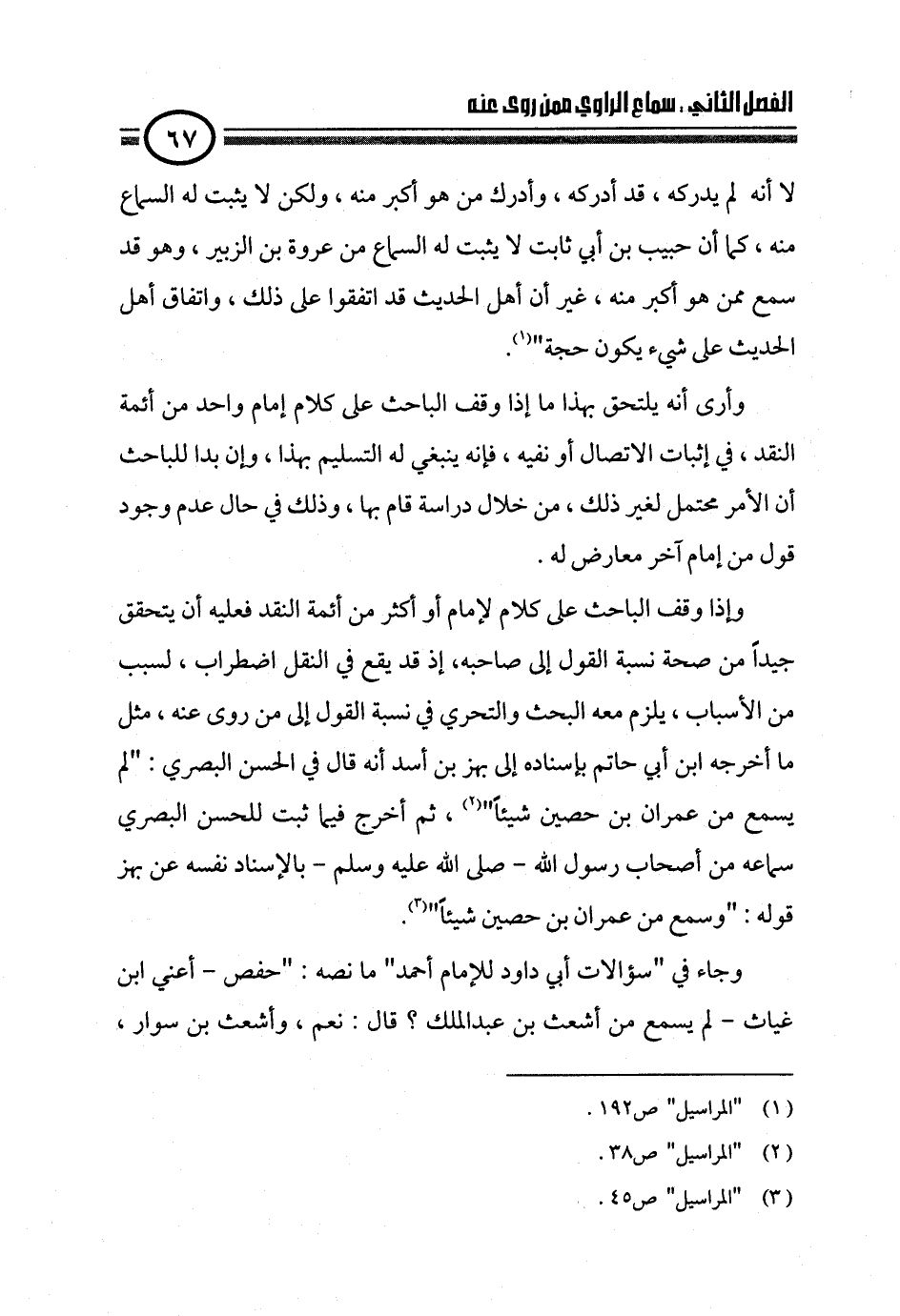 وإذا وقف الباحث على كلام لإمام أو أكثر من أئمة النقد فعليه أن يتحقق جيداً من صحة نسبة القول إلى صاحبه، إذ قد يقع في النقل اضطراب، لسبب من الأسباب، يلزم معه البحث والتحري في نسبة القول إلى من روى عنه، مثل ما أخرجه ابن أبي حاتم بإسناده إلى بهز بن أسد أنه قال في الحسن البصري: "لم يسمع من عمران بن حصين شيئاً" (¬٢)، ثم أخرج فيما ثبت للحسن البصري سماعه من أصحاب رسول الله - صلى الله عليه وسلم - بالإسناد نفسه عن بهز قوله: "وسمع من عمران بن حصين شيئاً" (¬٣).