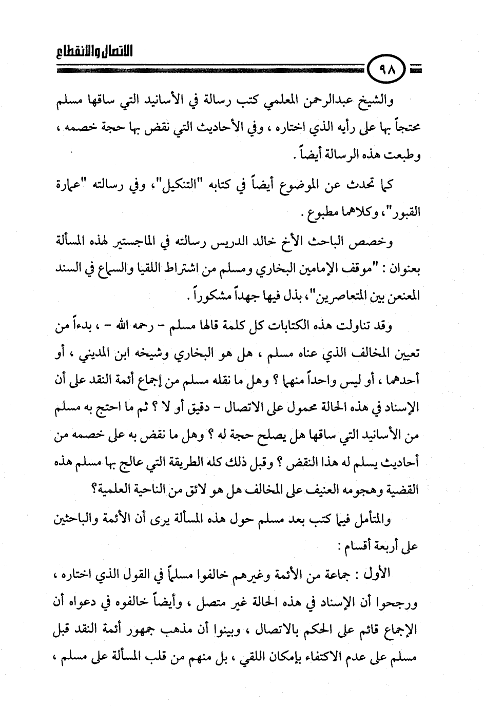 والشيخ عبدالرحمن المعلمي كتب رسالة في الأسانيد التي ساقها مسلم محتجاً بها على رأيه الذي اختاره، وفي الأحاديث التي نقض بها حجة خصمه، وطبعت هذه الرسالة أيضاً.