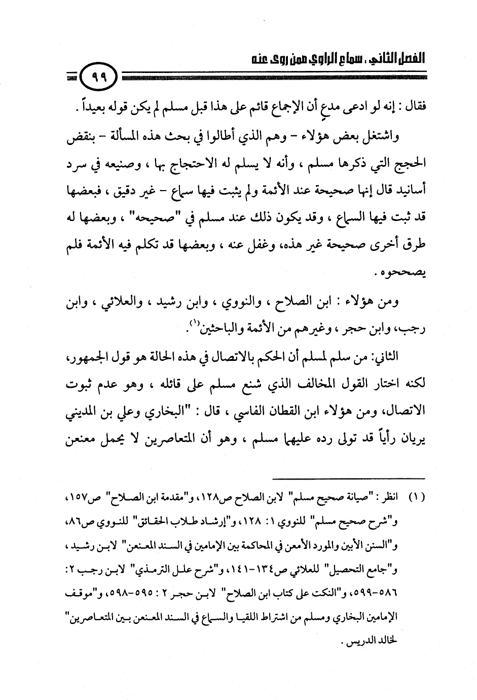 (¬١). انظر: "صيانة صحيح مسلم" لابن الصلاح ص ١٢٨، و"مقدمة ابن الصلاح" ص ١٥٧، و"شرح صحيح مسلم" للنووي ١: ١٢٨، و"إرشاد طلاب الحقائق" للنووي ص ٨٦، و"السنن الأبين والمورد الأمعن في المحاكمة بين الإمامين في السند المعنعن" لابن رشيد، و"جامع التحصيل" للعلائي ص ١٣٤ - ١٤١، و"شرح علل الترمذي" لابن رجب ٢: ٥٨٦ - ٥٩٩، و"النكت على كتاب ابن الصلاح" لابن حجر ٢: ٥٩٥ - ٥٩٨، و"موقف الإمامين البخاري ومسلم من اشتراط اللقيا والسماع في السند المعنعن بين المتعاصرين" لخالد الدريس.