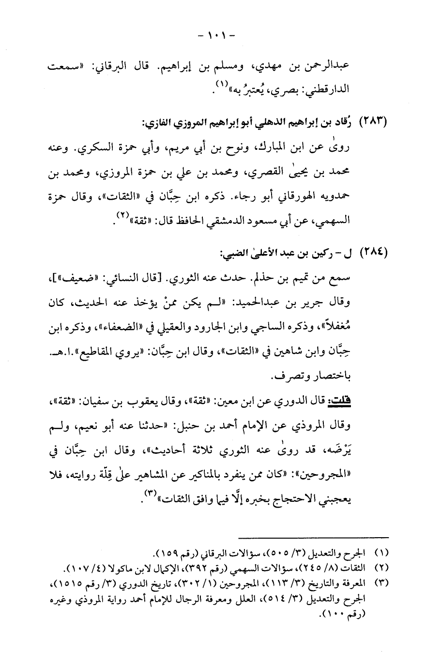 (¬3) المعرفة والتاريخ (3/ 113)، المجروحين (1/ 302)، تاريخ الدوري (3/ رقم 1515)، الجرح والتعديل (3/ 514)، العلل ومعرفة الرجال للإمام أحمد رواية المروذي وغيره (رقم 100).