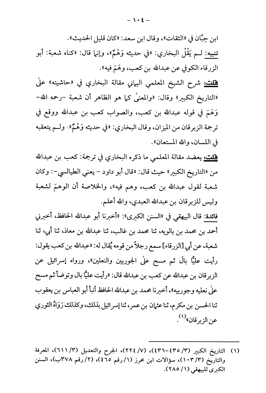 قلت: يعضد مقالة المعلمي ما ذكره البخاري في ترجمة: كعب بن عبد الله من "التاريخ الكبير" حيث قال: "قال أبو داود -يعني الطيالسي-: وكان شعبة لقول عبد الله بن كعب، وهم فيه"، والخلاصة أن الوهمَ لشعبة وليس للزبرقان بن عبد الله العبدي، والله أعلم.