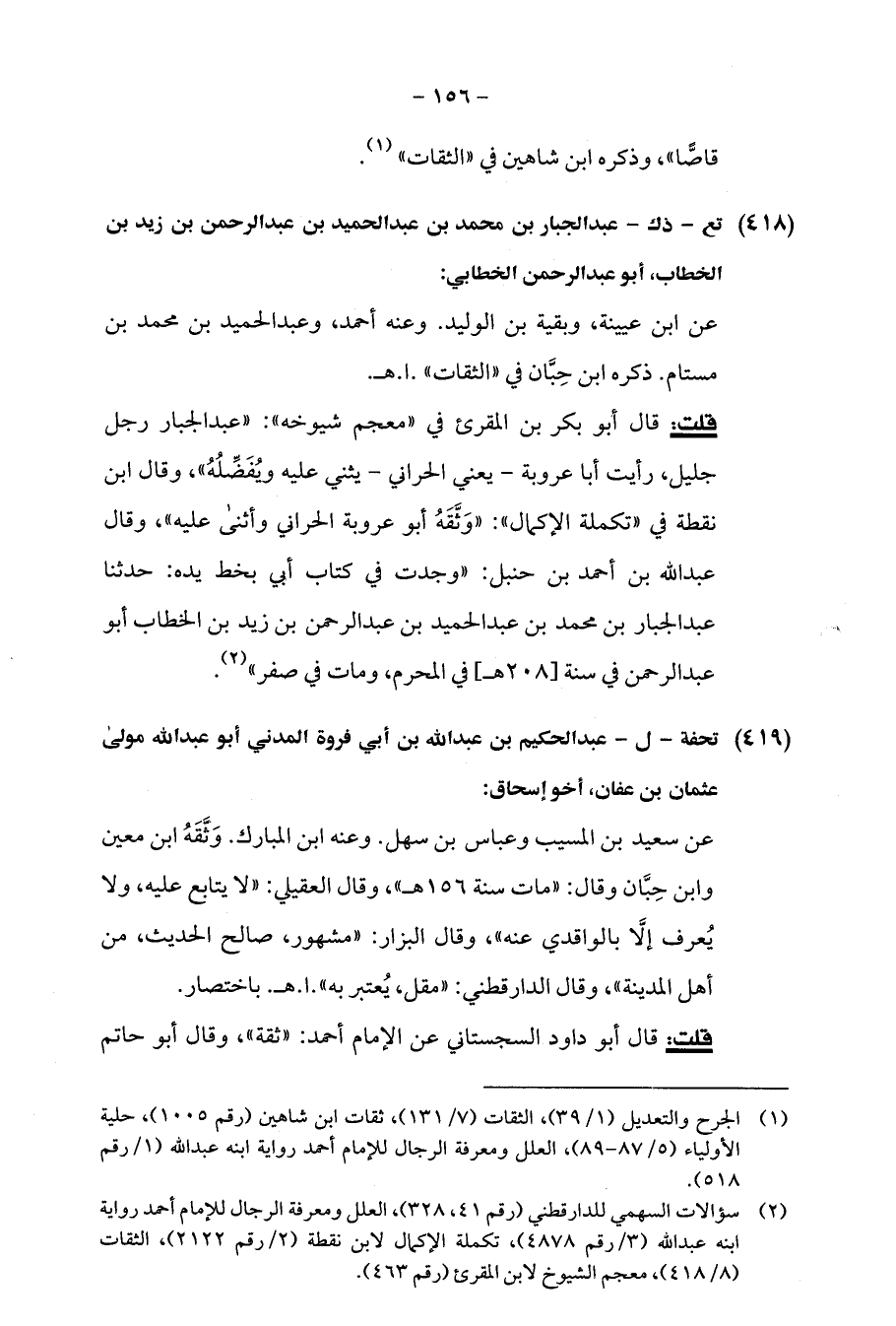 قلت: قال أبو بكر بن المقرئ في "معجم شيوخه": "عبد الجبار رجل جليل، رأيت أبا عروبة -يعني الحراني- يثني عليه ويُفَضِّلُهُ"، وقال ابن نقطة في "تكملة الإكمال": "وَثَّقَهُ أبو عروبة الحراني وأثنى عليه"، وقال عبد الله بن أحمد بن حنبل: "وجدت في كتاب أبي بخط يده: حدثنا عبد الجبار بن محمد بن عبد الحميد بن عبد الرحمن بن زيد بن الخطاب أبو عبد الرحمن في سنة [208 هـ] في المحرم، ومات في صفر" (¬2).