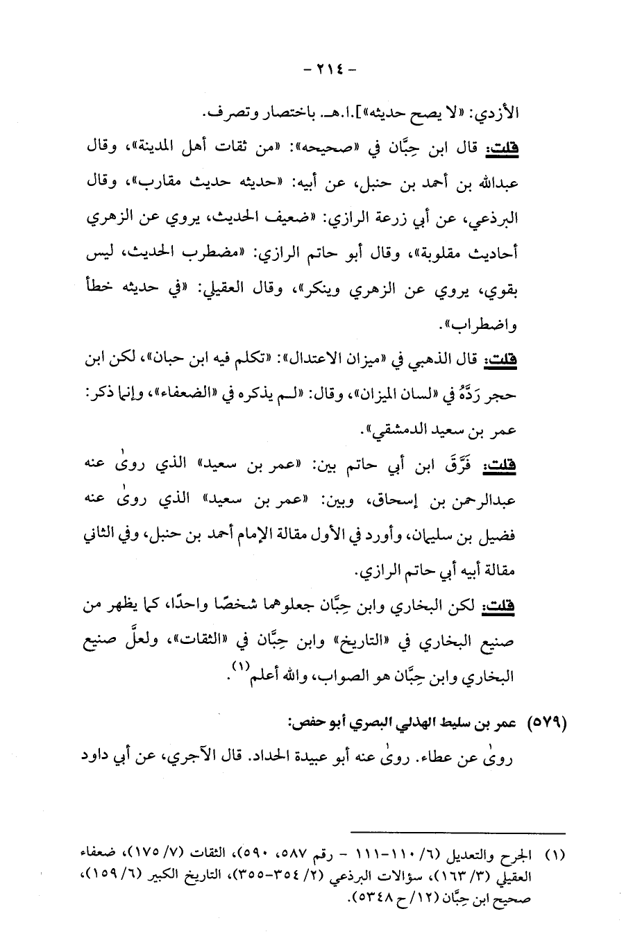 قلت: قال الذهبي في "ميزان الاعتدال": "تكلم فيه ابن حبان"، لكن ابن حجر رَدَّهُ في "لسان الميزان"، وقال: "لم يذكره في "الضعفاء"، وإنما ذكر: عمر بن سعيد الدمشقي".