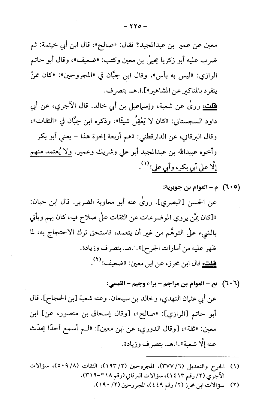 معين عن عمير بن عبد المجيد؟ فقال: "صالح"، قال ابن أبي خيثمة: ثم ضرب عليه أبو زكريا يحيى بن معين وكتب: "ضعيف"، وقال أبو حاتم الرازي: "ليس به بأس"، وقال ابن حِبَّان في "المجروحين": "كان ممنْ ينفرد بالمناكير عن المشاهير"].ا. هـ. بتصرف.