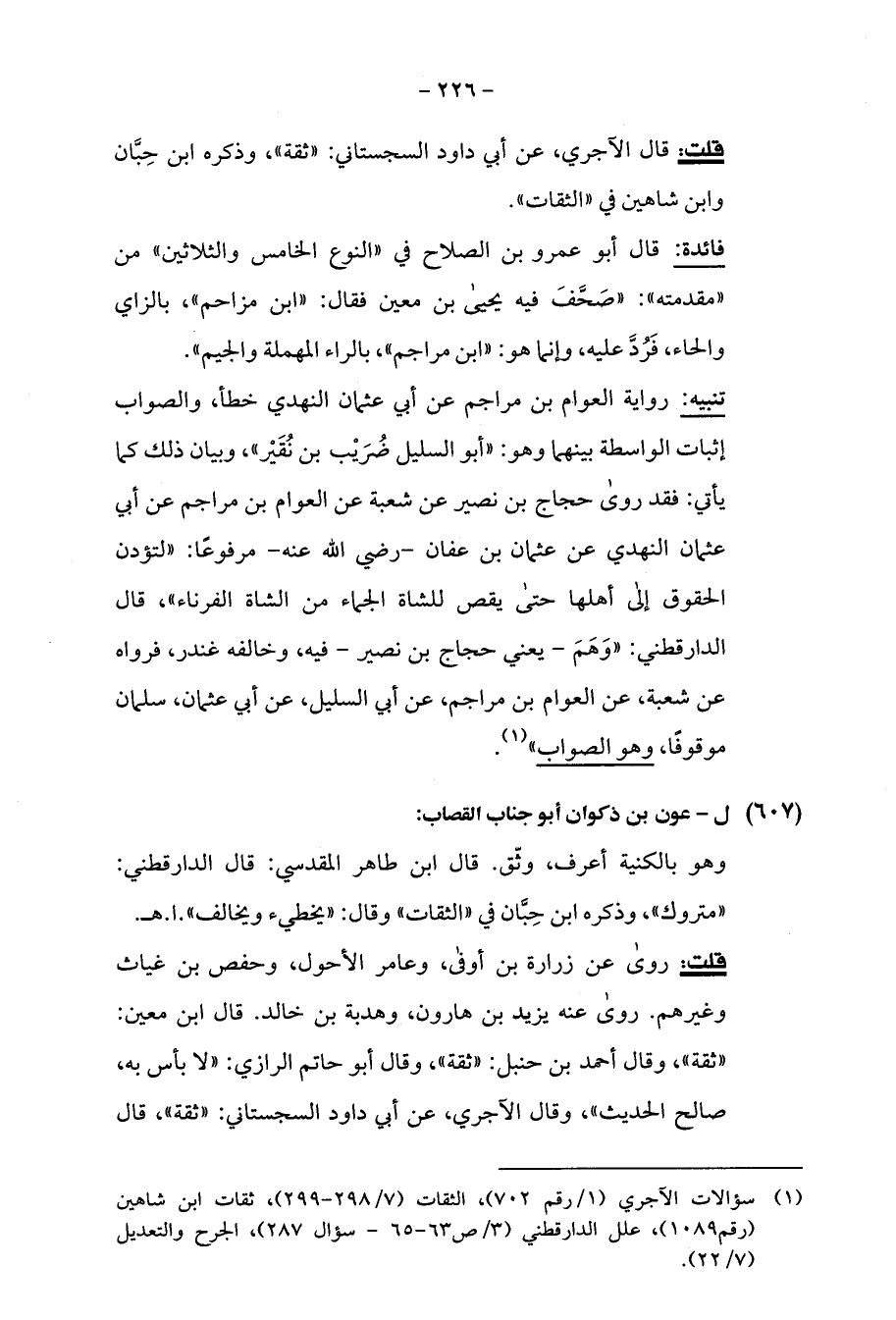 تنبيه: رواية العوام بن مراجم عن أبي عثمان النهدي خطأ، والصواب إثبات الواسطة بينهما وهو: "أبو السليل ضُرَيْب بن نُقَيْر"، وبيان ذلك كما يأتي: فقد روى حجاج بن نصير عن شعبة عن العوام بن مراجم عن أبي عثمان النهدي عن عثمان بن عفان -رضي الله عنه- مرفوعاً: "لتؤدن الحقوق إلى أهلها حتى يقص للشاة الجماء من الشاة الفرناء"، قال الدارقطني: "وَهَمَ -يعني حجاج بن نصير- فيه، وخالفه غندر، فرواه عن شعبة، عن العوام بن مراجم، عن أبي السليل، عن أبي عثمان، سلمان موقوفًا، وهو الصواب" (¬1).