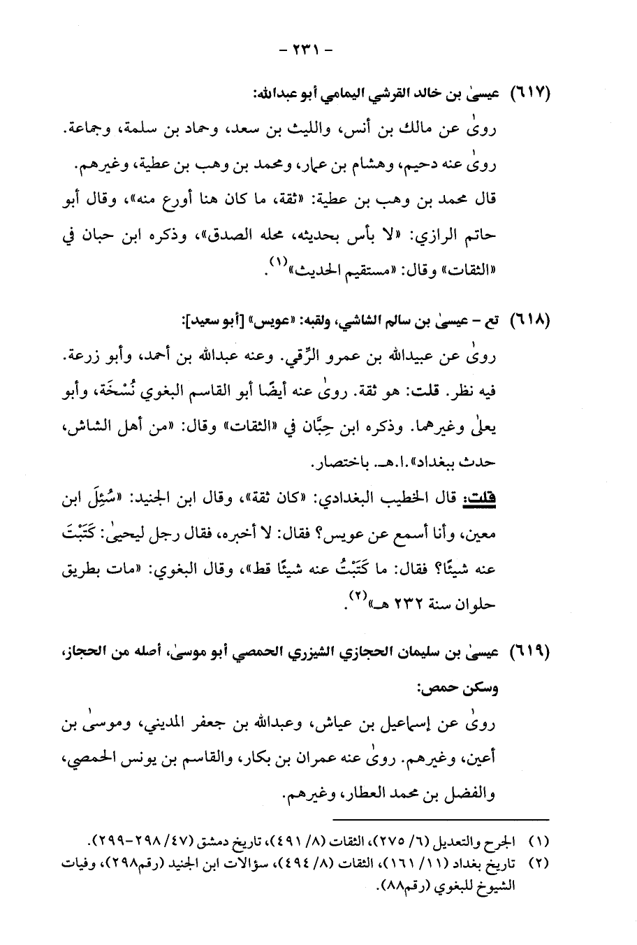 قلت: قال الخطيب البغدادي: "كان ثقة"، وقال ابن الجنيد: "سُئِلَ ابن معين، وأنا أسمع عن عويس؟ فقال: لا أخبره، فقال رجل ليحيى: كَتَبْتَ عنه شيئاً؟ فقال: ما كَتَبْتُ عنه شيئاً قط"، وقال البغوي: "مات بطريق حلوان سنة 232 هـ" (¬2).