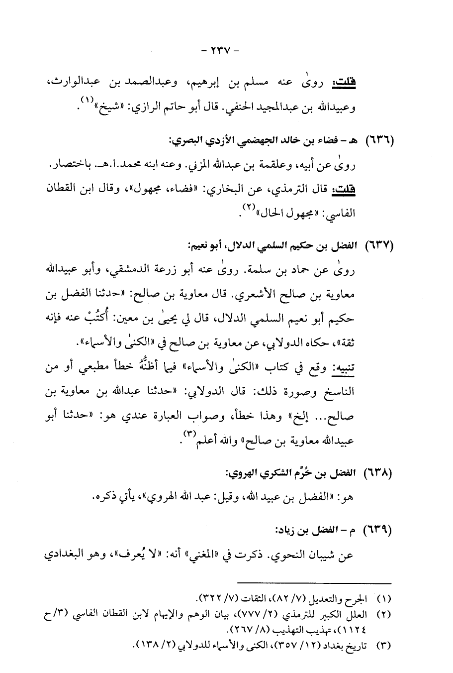 تنبيه: وقع في كتاب "الكنى والأسماء" فيما أظنُّهُ خطأ مطبعي أو من الناسخ وصورة ذلك: قال الدولابي: "حدثنا عبد الله بن معاوية بن صالح ... إلخ" وهذا خطأ، وصواب العبارة عندي هو: "حدثنا أبو عبيد الله معاوية بن صالح" والله أعلم (¬3).