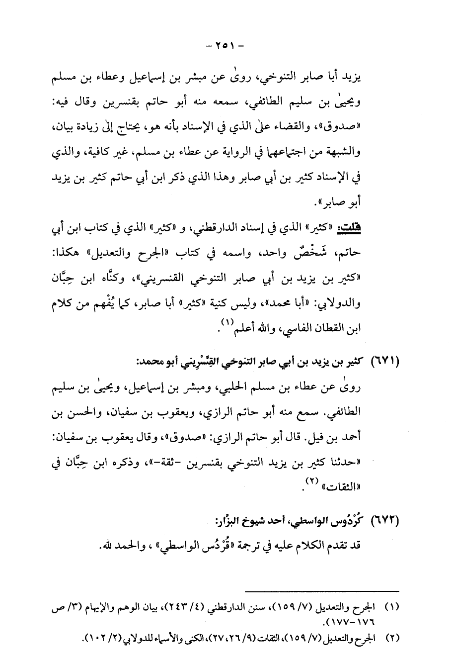 قلت: "كثير" الذي في إسناد الدارقطني، و"كثير" الذي في كتاب ابن أبي حاتم، شَخْصٌ واحد، واسمه في كتاب "الجرح والتعديل" هكذا: "كثير بن يزيد بن أبي صابر التنوخي القنسريني"، وكنَّاه ابن حِبَّان والدولابي: "أبا محمد"، وليس كنية "كثير" أبا صابر، كما يُفْهم من كلام ابن القطان الفاسي، والله أعلم (¬1).