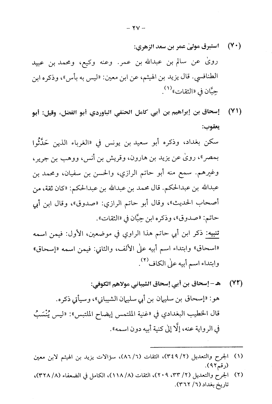 (¬2) الجرح والتعديل (2/ 33، 209)، الثقات (8/ 118)، الكامل في الضعفاء (8/ 328)، تاريخ بغداد (6/ 362).