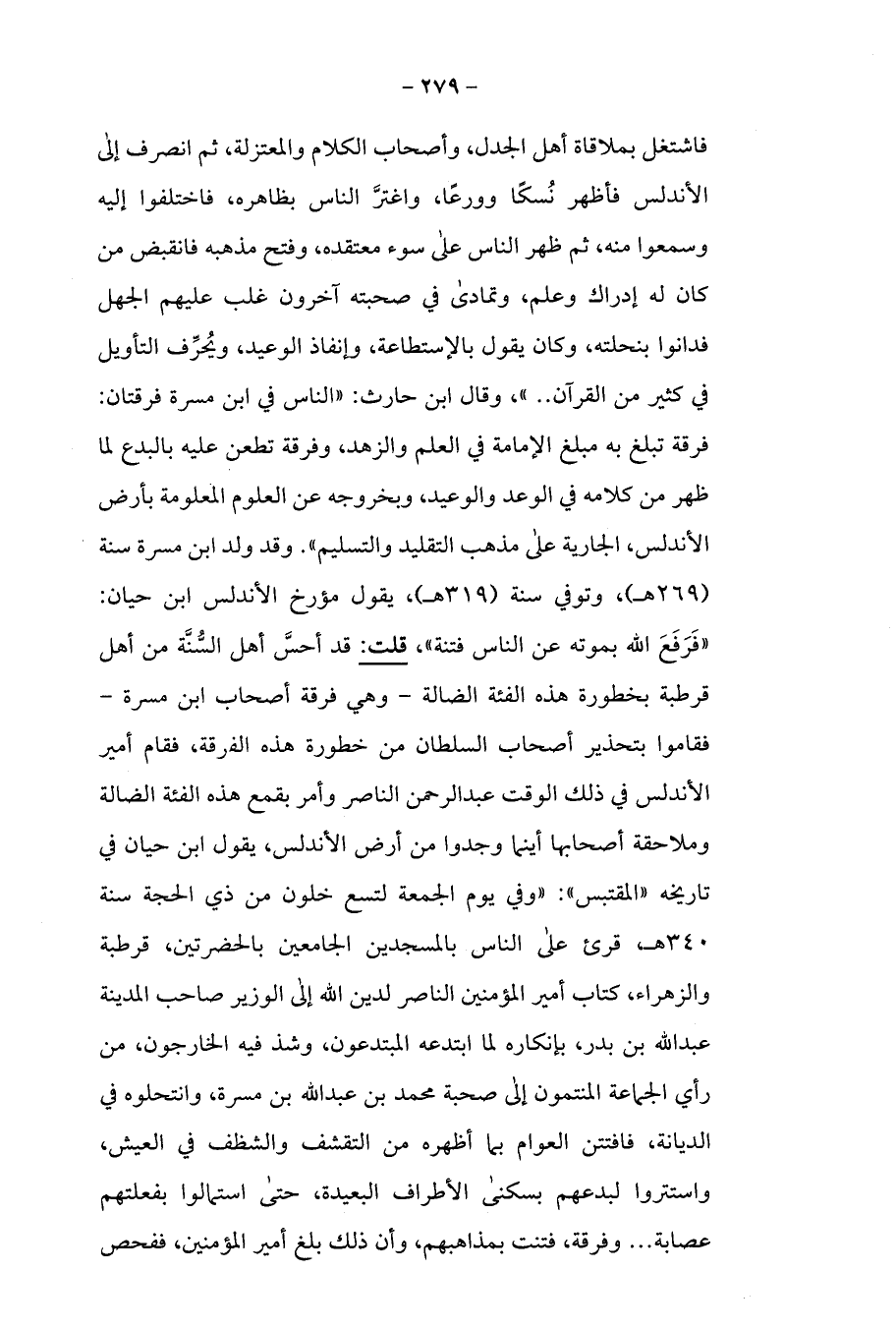 فاشتغل بملاقاة أهل الجدل، وأصحاب الكلام والمعتزلة، ثم انصرف إلى الأندلس فأظهر نُسكًا وورعًا، واغترَّ الناس بظاهره، فاختلفوا إليه وسمعوا منه، ثم ظهر الناس على سوء معتقده، وفتح مذهبه فانقبض من كان له إدراك وعلم، وتمادى في صحبته آخرون غلب عليهم الجهل فدانوا بنحلته، وكان يقول بالاستطاعة، وإنفاذ الوعيد، ويُحرِّف التأويل في كثير من القرآن .. "، وقال ابن حارث: "الناس في ابن مسرة فرقتان: فرقة تبلغ به مبلغ الإمامة في العلم والزهد، وفرقة تطعن عليه بالبدع لما ظهر من كلامه في الوعد والوعيد، وبخروجه عن العلوم المعلومة بأرض الأندلس، الجارية على مذهب التقليد والتسليم". وقد ولد ابن مسرة سنة (269 هـ)، وتوفي سنة (319 هـ)، يقول مؤرخ الأندلس ابن حيان: "فَرَفَعَ الله بموته عن الناس فتنة"، قلت: قد أحسَّ أهل السُّنَّة من أهل قرطبة بخطورة هذه الفئة الضالة -وهي فرقة أصحاب ابن مسرة- فقاموا بتحذير أصحاب السلطان من خطورة هذه الفرقة، فقام أمير الأندلس في ذلك الوقت عبد الرحمن الناصر وأمر بقمع هذه الفئة الضالة وملاحقة أصحابها أينما وجدوا من أرض الأندلس، يقول ابن حيان في تاريخه "المقتبس": "وفي يوم الجمعة لتسع خلون من ذي الحجة سنة 340 هـ، قرئ على الناس بالمسجدين الجامعين بالحضرتين، قرطبة والزهراء، كتاب أمير المؤمنين الناصر لدين الله إلى الوزير صاحب المدينة عبد الله بن بدر، بإنكاره لما ابتدعه المبتدعون، وشذ فيه الخارجون، من رأي الجماعة المنتمون إلى صحبة محمد بن عبد الله بن مسرة، وانتحلوه في الديانة، فافتتن العوام بما أظهره من التقشف والشظف في العيش، واستتروا لبدعهم بسكنى الأطراف البعيدة، حتى استمالوا بفعلتهم عصابة ... وفرقة، فتنت بمذاهبهم، وأن ذلك بلغ أمير المؤمنين، ففحص