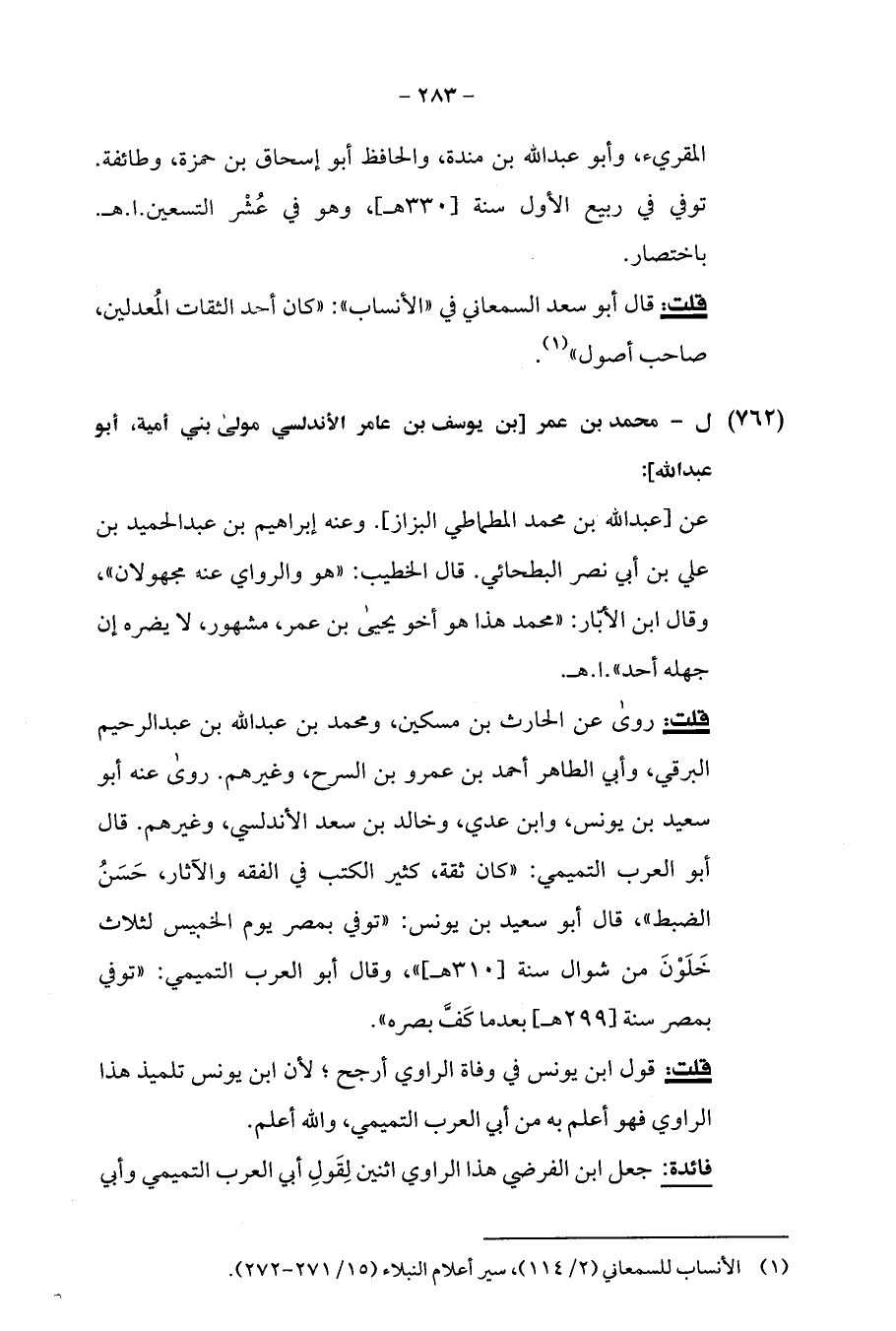 قلت: قول ابن يونس في وفاة الراوي أرجح؛ لأن ابن يونس تلميذ هذا الراوي فهو أعلم به من أبي العرب التميمي، والله أعلم.