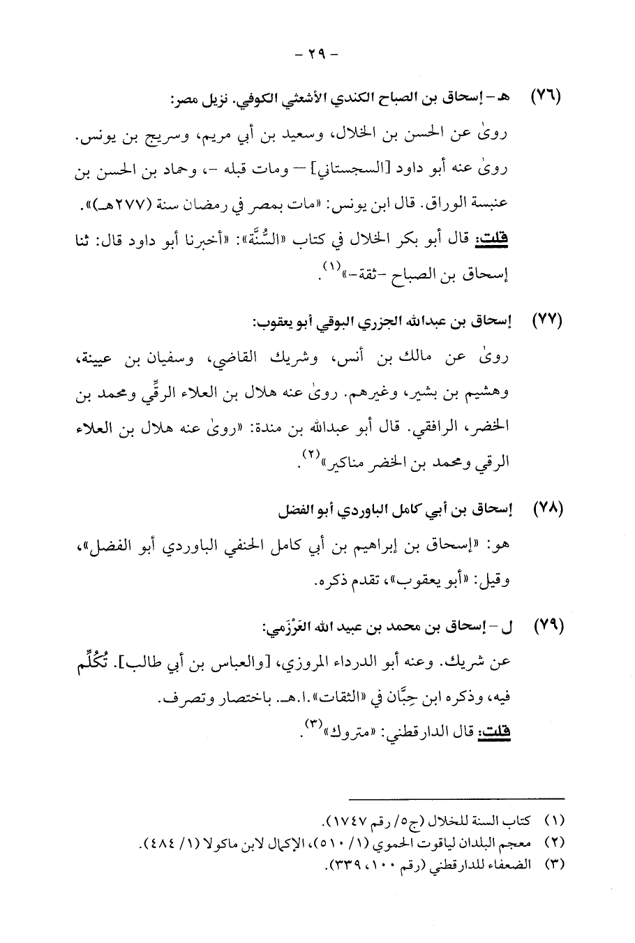 قلت: قال أبو بكر الخلال في كتاب "السُّنَّة": "أخبرنا أبو داود قال: ثنا إسحاق بن الصباح -ثقة-" (¬1).