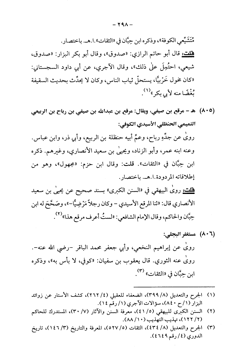 قلت: روى البيهقي في "السنن الكبرى" بسند صحيح عن يحيى بن سعيد الأنصاري قال: "ثنا المرقع الأسيدي -وكان رجلاً مَرْضِيًّا-"، وصَحَّحَ له ابن حِبَّان والحاكم، وقال الإمام الشافعي: "لستُ أعرف مرقع هذا" (¬2).