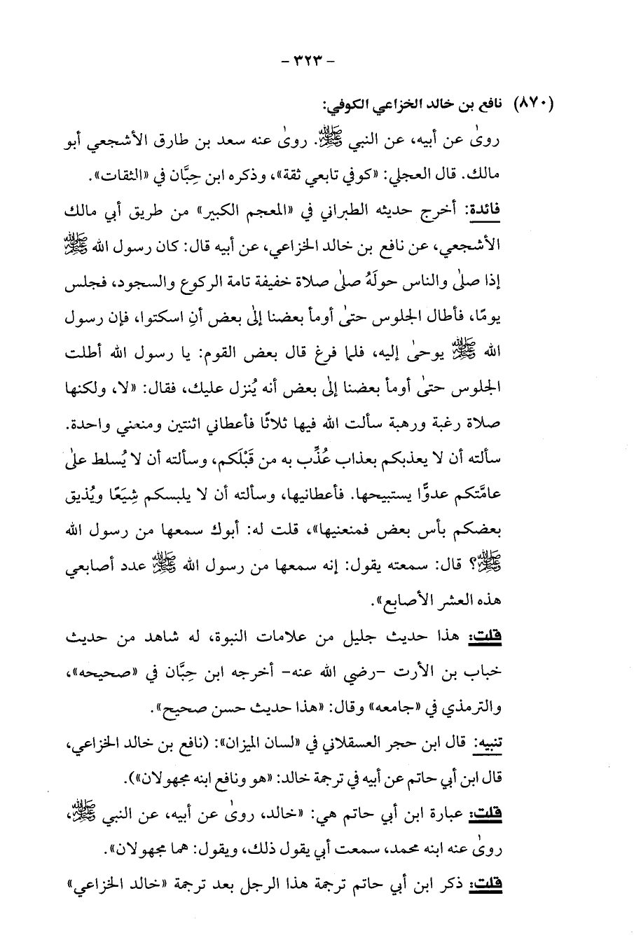 تنبيه: قال ابن حجر العسقلاني في "لسان الميزان": (نافع بن خالد الخزاعي، قال ابن أبي حاتم عن أبيه في ترجمة خالد: "هو ونافع ابنه مجهولان").