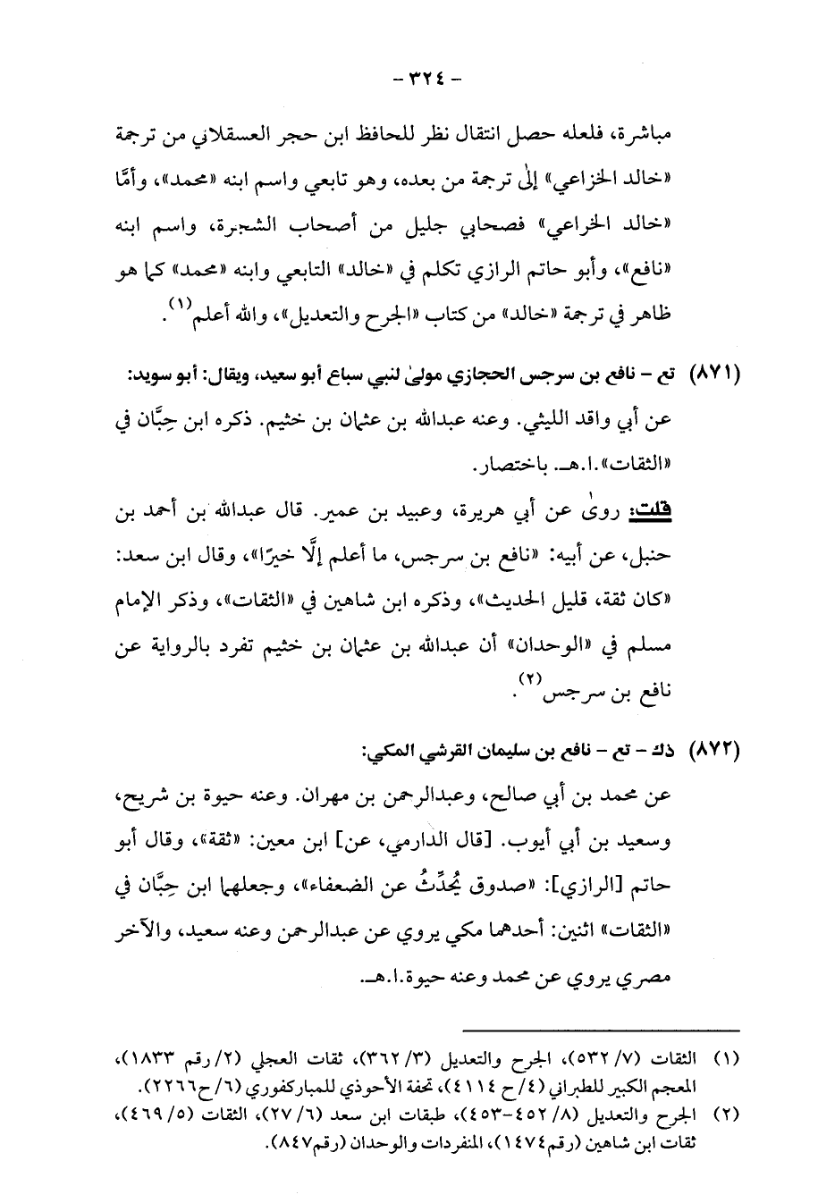 قلت: روى عن أبي هريرة، وعبيد بن عمير. قال عبد الله بن أحمد بن حنبل، عن أبيه: "نافع بن سرجس، ما أعلم إلَّا خيرًا"، وقال ابن سعد: "كان ثقة، قليل الحديث"، وذكره ابن شاهين في "الثقات"، وذكر الإمام مسلم في "الوحدان" أن عبد الله بن عثمان بن خثيم تفرد بالرواية عن نافع بن سرجس (¬2).