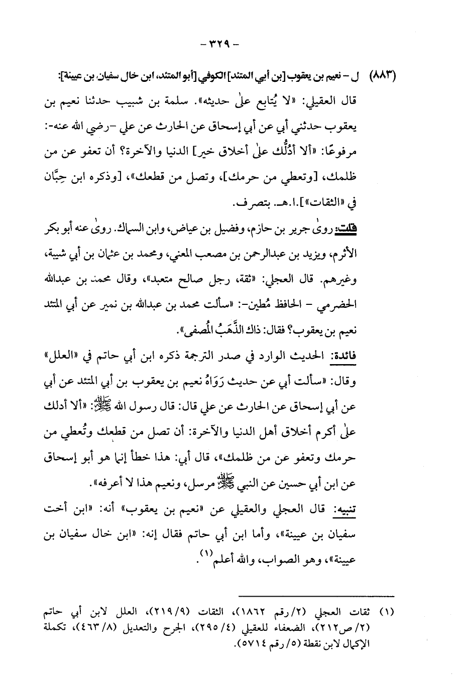 تنبيه: قال العجلي والعقيلي عن "نعيم بن يعقوب" أنه: "ابن أخت سفيان بن عيينة"، وأما ابن أبي حاتم فقال إنه: "ابن خال سفيان بن عيينة"، وهو الصواب، والله أعلم (¬1).