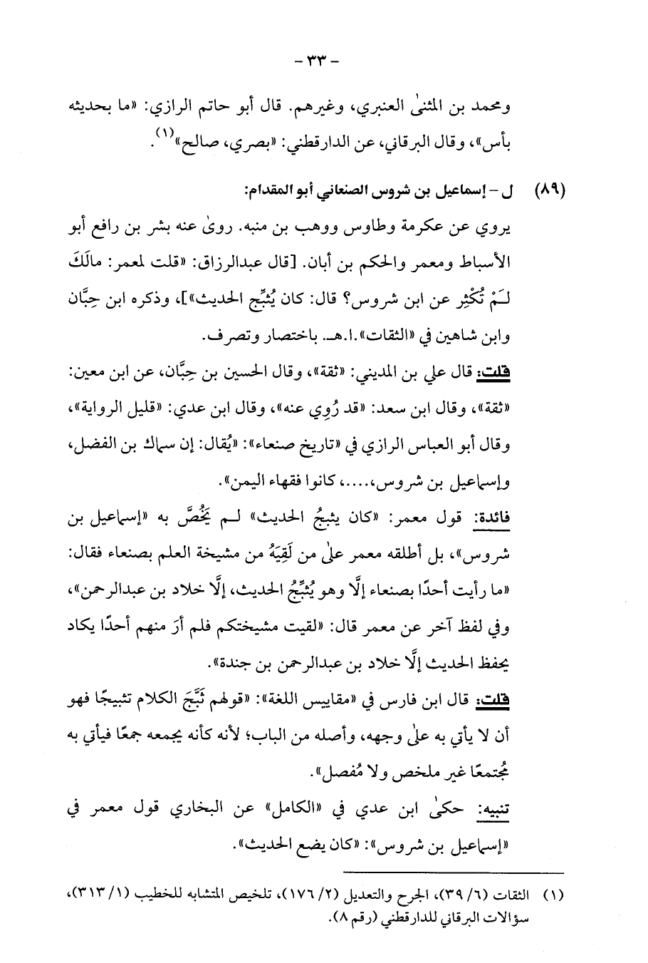 فائدة: قول معمر: "كان يثبجُ الحديث" لم يَخُصَّ به "إسماعيل بن شروس"، بل أطلقه معمر على من لَقِيَهُ من مشيخة العلم بصنعاء فقال: "ما رأيت أحدًا بصنعاء إلَّا وهو يُثبِّجُ الحديث، إلاَّ خلاد بن عبد الرحمن"، وفي لفظ آخر عن معمر قال: "لقيت مشيختكم فلم أرَ منهم أحدًا يكاد يحفظ الحديث إلاَّ خلاد بن عبد الرحمن بن جندة".