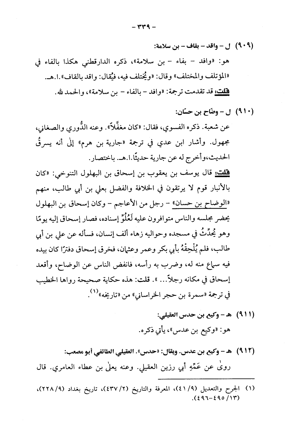 قلت: قال يوسف بن يعقوب بن إسحاق بن البهلول التنوخي: "كان بالأنبار قوم لا يرتقون في الخلافة والفضل بعلي بن أبي طالب، منهم "الوضاح بن حسان" -رجل من الأعاجم- وكان إسحاق بن البهلول يحضر مجلسه والناس متوافرون عليه لَعُلُوِّ إسناده، فصار إسحاق إليه يومًا وهو يُحدِّثُ في مسجده وحواليه زهاء ألف إنسان، فسأله عن علي بن أبي طالب، فلم يُلْحِقْهُ بأبي بكر وعمر وعثمان، فخرق إسحاق دفترًا كان بيده فيه سماع منه له، وضرب به رأسه، فانفض الناس عن الوضاح، وأقعد إسحاق في مكانه رجلاً ... ". قلت: هذه حكاية صحيحة رواها الخطيب في ترجمة "سمرة بن حجر الخراساني" من، "تاريخه" (¬1).