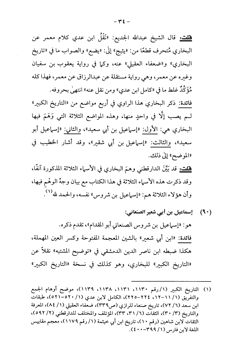 قلت: قد بَيَّنَ الدارقطني وهمَ البخاري في الأسماء الثلاثة المذكورة آنفًا، وقد ذكرت هذه الأسماء الثلاثة في هذا الكتاب مع بيان وجهُ الوهْمِ فيها، وأن هؤلاء الثلاثة هم: "إسماعيل بن شروس" نفسه، والحمد لله (¬1).