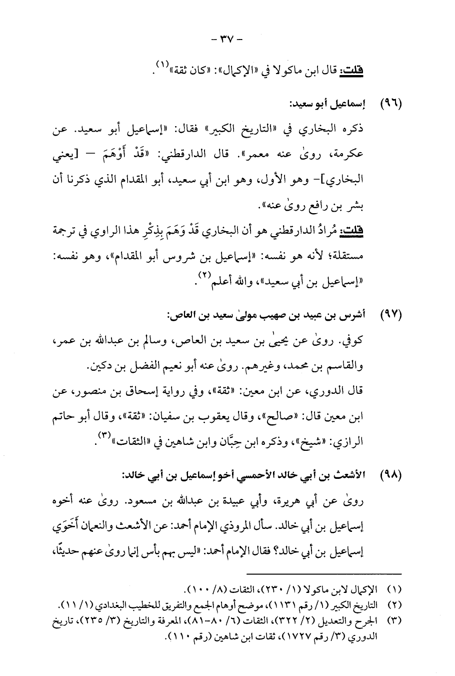 قلت: مُرادُ الدارقطني هو أن البخاري قَدْ وَهَمَ بِذِكْرِ هذا الراوي في ترجمة مستقلة، لأنه هو نفسه: "إسماعيل بن شروس أبو المقدام"، وهو نفسه: "إسماعيل بن أبي سعيد"، والله أعلم (¬2).