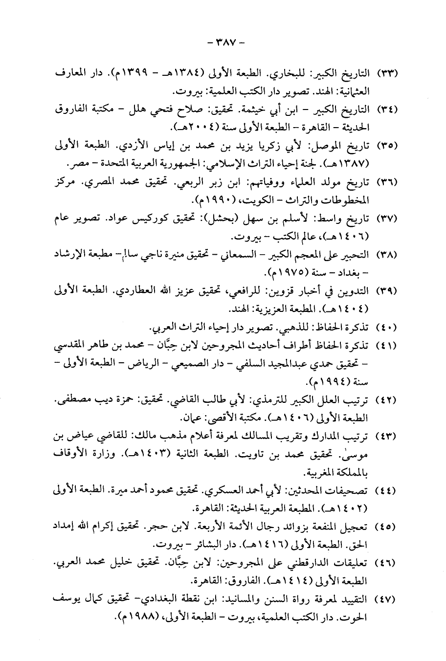 (33) التاريخ الكبير: للبخاري. الطبعة الأولى (1384 هـ - 1399 م). دار المعارف العثمانية: الهند. تصوير دار الكتب العلمية: بيروت.