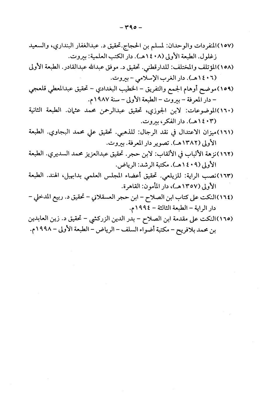 (165) النكت على مقدمة ابن الصلاح - بدر الدين الزركشي - تحقيق د. زين العابدين بن محمد بلافريح - مكتبة أضواء السلف - الرياض - الطبعة الأولى - 1998 م.