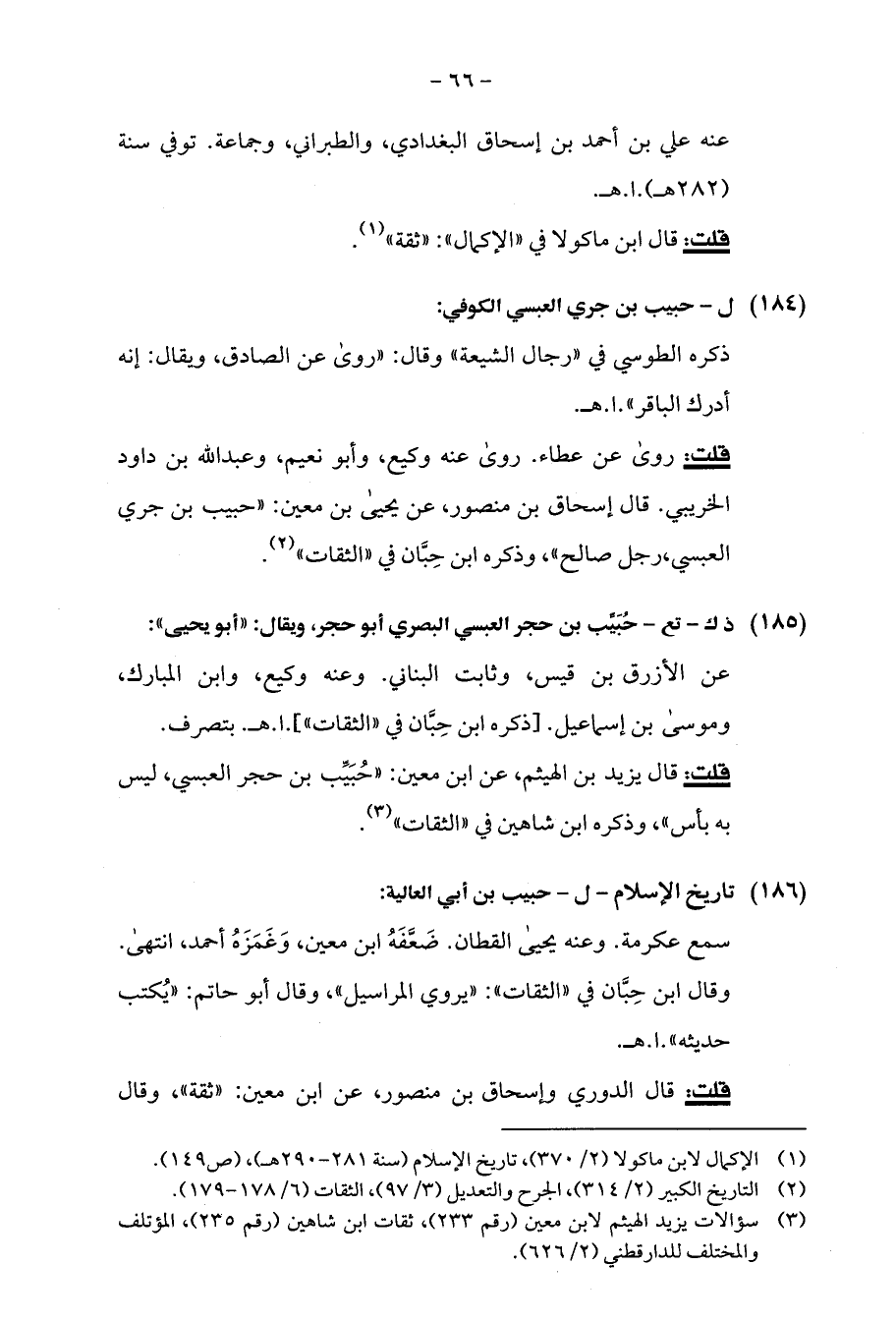قلت: قال يزيد بن الهيثم، عن ابن معين: "حُبَيِّب بن حجر العبسي، ليس به بأس"، وذكره ابن شاهين في "الثقات" (¬3).