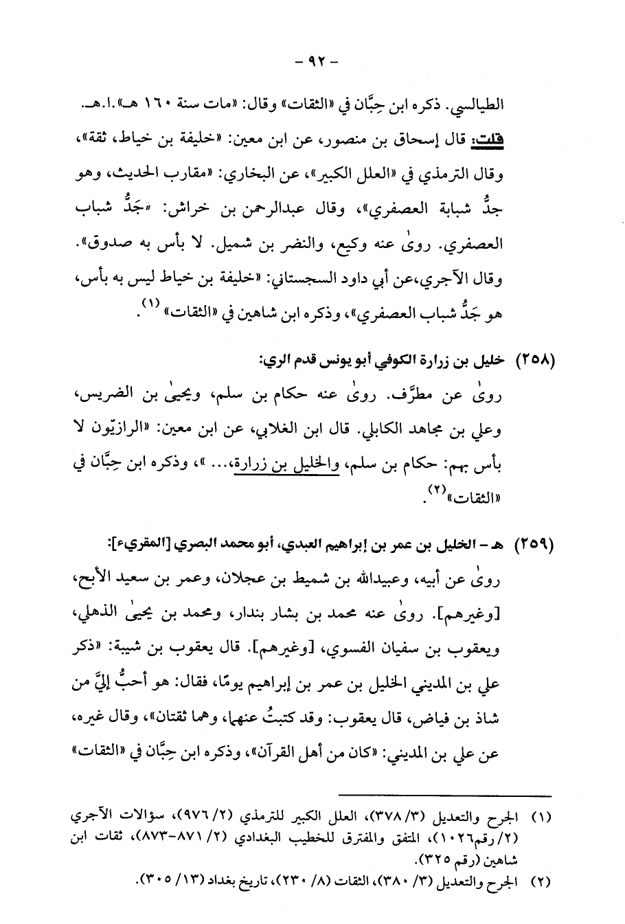 قلت: قال إسحاق بن منصور، عن ابن معين: "خليفة بن خياط، ثقة"، وقال الترمذي في "العلل الكبير"، عن البخاري: "مقارب الحديث، وهو جدُّ شبابة العصفري"، وقال عبد الرحمن بن خراش: "جَدُّ شباب العصفري. روى عنه وكيع، والنضر بن شميل. لا بأس به صدوق". وقال الآجري، عن أبي داود السجستاني: "خليفة بن خياط ليس به بأس، هو جَدُّ شباب العصفري"، وذكره ابن شاهين في "الثقات" (¬1).