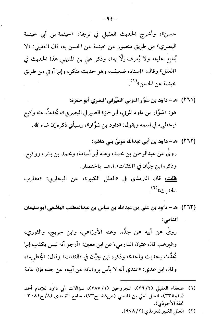 (¬1) ضعفاء العقيلي (2/ 29)، المجروحين (1/ 287)، سؤالات أبي داود للإمام أحمد (رقم 335)، العلل لعلي بن المديني (ص 58 - ح 73)، جامع الترمذي (8/ ح 3084 - تحفة الأحوذي).