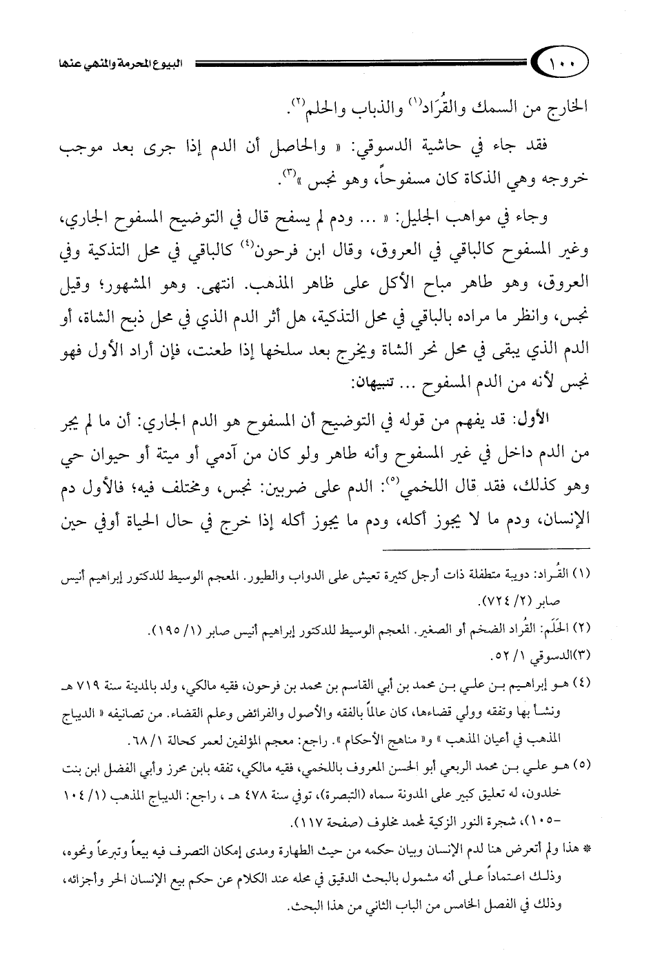الأول: قد يفهم من قوله في التوضيح أن المسفوح هو الدم الجاري: أن ما لم يجر من الدم داخل في غير المسفوح وأنه طاهر ولو كان من آدمي أو ميتة أو حيوان حي وهو كذلك، فقد قال اللخمي5: الدم على ضربين: نجس، ومختلف فيه؛ فالأول دم الإنسان، ودم ما لا يجوز أكله، ودم ما يجوز أكله إذا خرج في حال الحياة أوفي حين