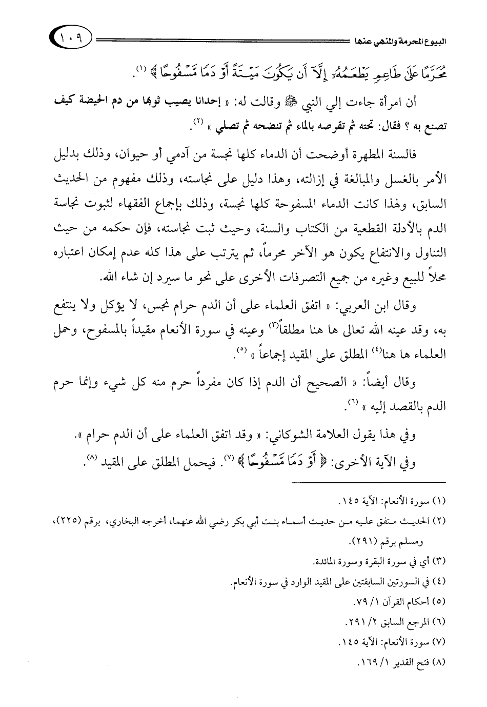فالسنة المطهرة أوضحت أن الدماء كلها نجسة من آدمي أو حيوان، وذلك بدليل الأمر بالغسل والمبالغة في إزالته، وهذا دليل على نجاسته، وذلك مفهوم من الحديث السابق، ولهذا كانت الدماء المسفوحة كلها نجسة، وذلك بإجماع الفقهاء لثبوت نجاسة الدم بالأدلة القطعية من الكتاب والسنة، وحيث ثبت نجاسته، فإن حكمه من حيث التناول والانتفاع يكون هو الآخر محرماً، ثم يترتب على هذا كله عدم إمكان اعتباره محلاً للبيع وغيره من جميع التصرفات الأخرى على نحو ما سيرد إن شاء الله.