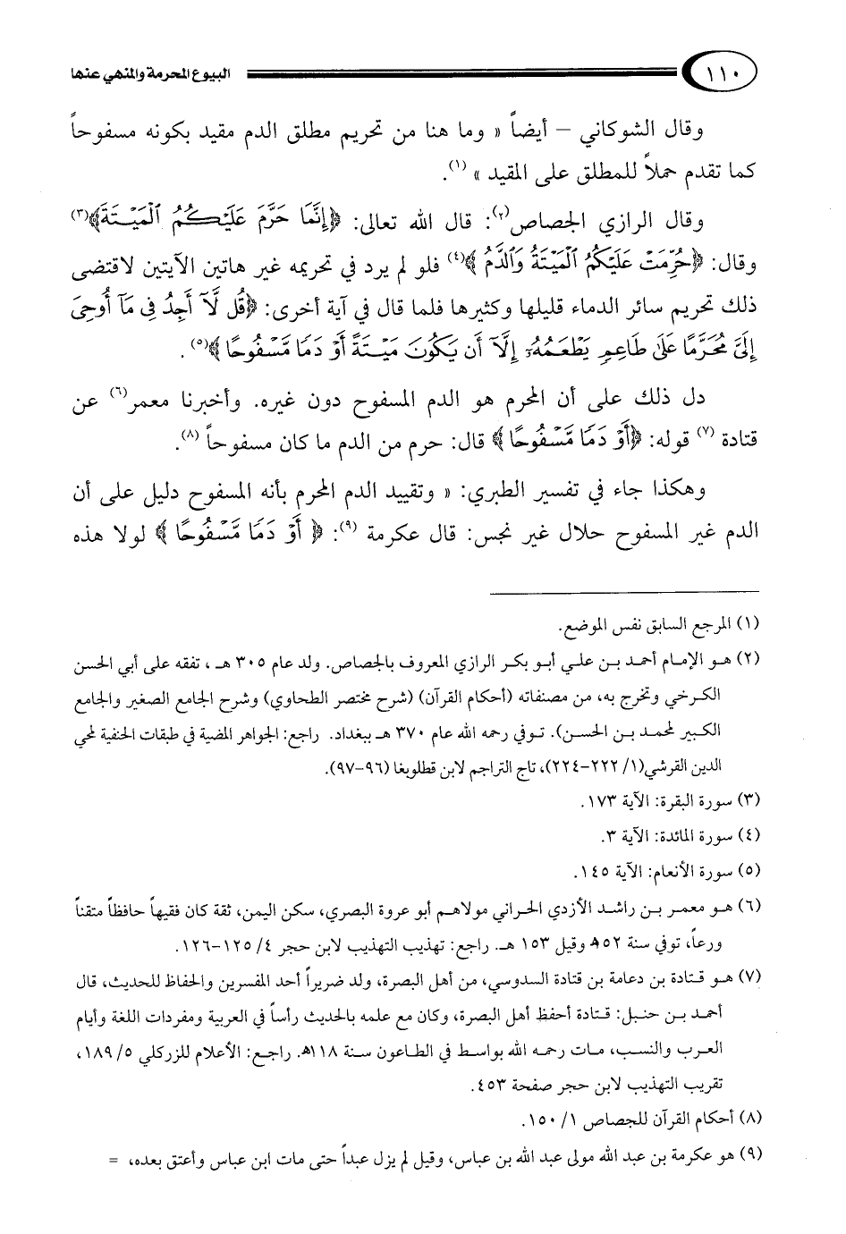 وقال الرازي الجصاص2: قال الله تعالى: {إِنَّمَا حَرَّمَ عَلَيْكُمُ الْمَيْتَةَ} 3 وقال: {حَرَّمَ عَلَيْكُمُ الْمَيْتَةَ وَالدَّمَ} 4 فلو لم يرد في تحريمه غير هاتين الآيتين لاقتضى ذلك تحريم سائر الدماء قليلها وكثيرها فلما قال في آية أخرى: {قُلْ لا أَجِدُ فِي مَا أُوحِيَ إِلَيَّ مُحَرَّماً عَلَى طَاعِمٍ يَطْعَمُهُ إِلَّا أَنْ يَكُونَ مَيْتَةً أَوْ دَماً مَسْفُوحاً} 5.