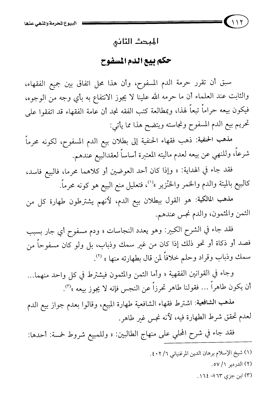 سبق أن تقرر حرمة الدم المسفوح، وأن هذا محل اتفاق بين جميع الفقهاء، والثابت عند العلماء أن ما حرمه الله علينا لا يجوز الانتفاع به بأي وجه من الوجوه، فيكون بيعه حراماً تبعاً لهذا، وبمطالعة كتب الفقه نجد أن عامة الفقهاء قد اتفقوا على تحريم بيع الدم المسفوح ونجاسته ويتضح هذا مما يأتي:
