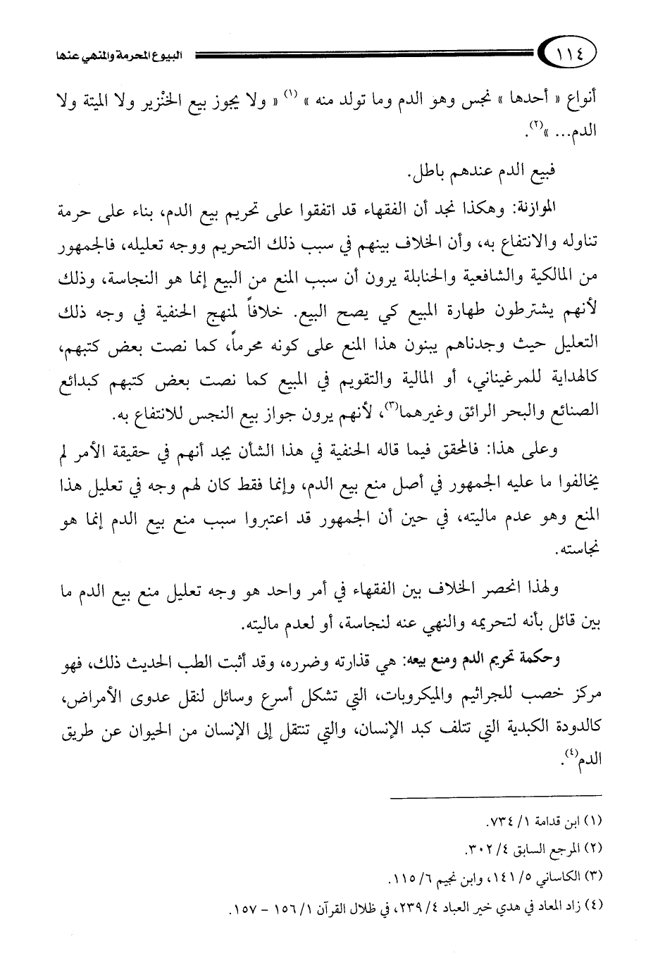 الموازنة: وهكذا نجد أن الفقهاء قد اتفقوا على تحريم بيع الدم، بناء على حرمة تناوله والانتفاع به، وأن الخلاف بينهم في سبب ذلك التحريم ووجه تعليله، فالجمهور من المالكية والشافعية والحنابلة يرون أن سبب المنع من البيع إنما هو النجاسة، وذلك لأنهم يشترطون طهارة المبيع كي يصح البيع. خلافاً لمنهج الحنفية في وجه ذلك التعليل حيث وجدناهم يبنون هذا المنع على كونه محرماً، كما نصت بعض كتبهم، كالهداية للمرغيناني، أو المالية والتقويم في المبيع كما نصت بعض كتبهم كبدائع الصنائع والبحر الرائق وغيرهما3، لأنهم يرون جواز بيع النجس للانتفاع به.