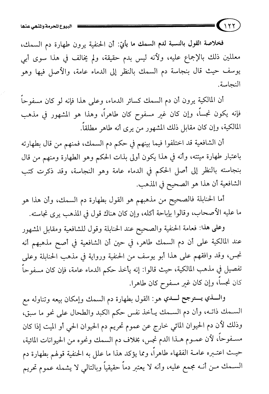 والذي يترجح لدي هو: القول بطهارة دم السمك وإمكان بيعه وتناوله مع السمك ذاته، وأن دم السمك يأخذ نفس حكم الكبد والطحال على نحو ما سبق، وذلك لأن دم الحيوان المائي خارج عن عموم تحريم دم الحيوان الحي أو الميت إذا كان مسفوحاً، لأن عموم هذا الدم نجس، بخلاف دم السمك ونحوه من الحيوانات المائية، حيث اعتبره عامة الفقهاء طاهراً، ومما يؤكد هذا ما علل به الحنفية قولهم بطهارة دم السمك من أنه مجمع عليه، وأنه لا يعتبر دماً حقيقياً وبالتالي لا يشمله عموم تحريم