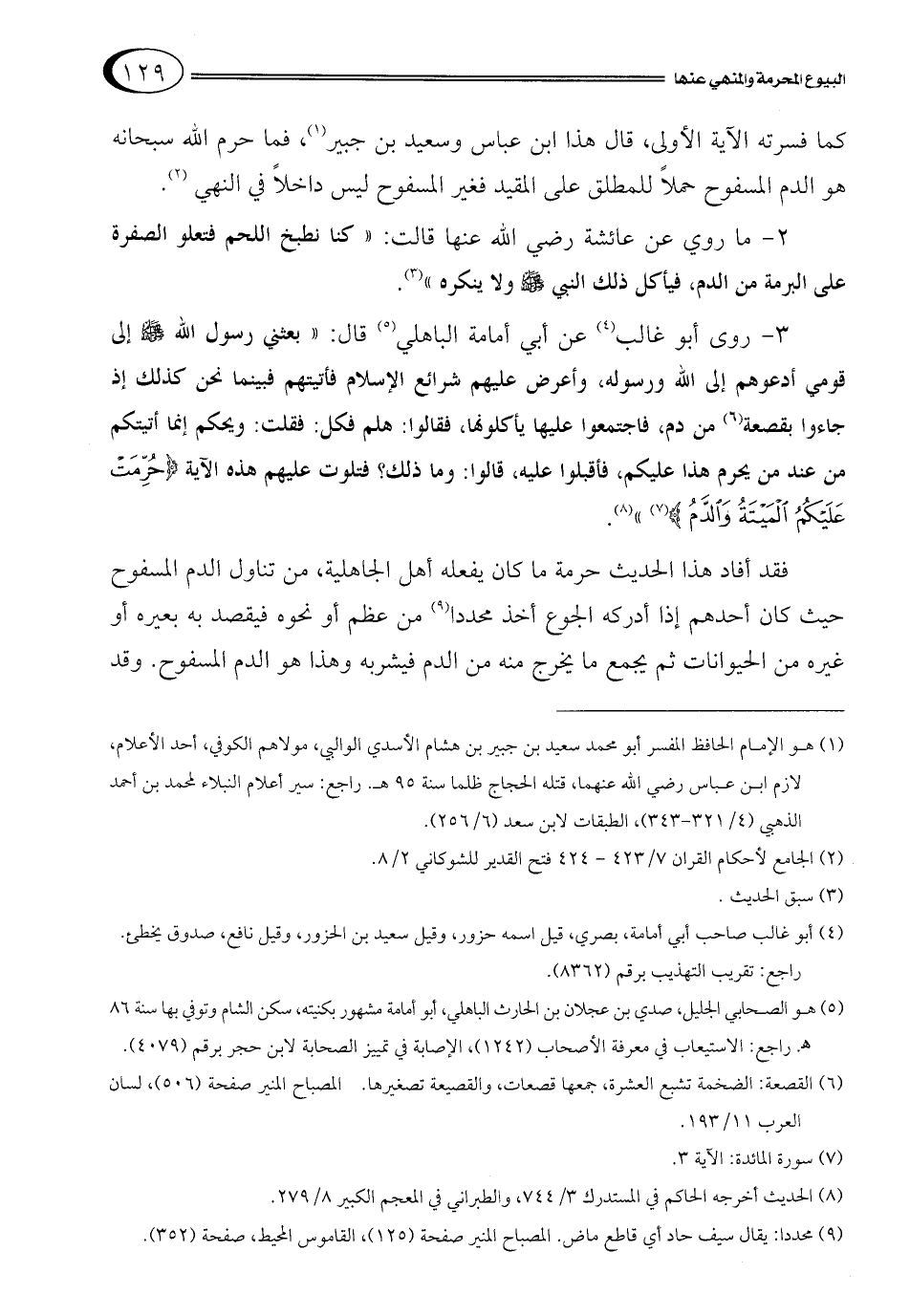 3- روى أبو غالب4 عن أبي أمامة الباهلي5 قال: "بعثني رسول الله صلى الله عليه وسلم إلى قومي أدعوهم إلى الله ورسوله، وأعرض عليهم شرائع الإسلام فأتيتهم فبينما نحن كذلك إذ جاءوا بقصعة6 من دم، فاجتمعوا عليها يأكلونها، فقالوا: هلم فكل: فقلت: ويحكم إنما أتيتكم من عند من يحرم هذا عليكم، فأقبلوا عليه، قالوا: وما ذلك؟ فتلوت عليهم هذه الآية {حُرِّمَتْ عَلَيْكُمُ الْمَيْتَةُ وَالدَّمُ} 7"8.