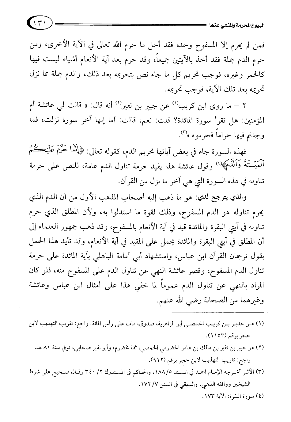 فهذه السورة جاء في بعض آياتها تحريم الدم، كقوله تعالى: {إِنَّمَا حَرَّمَ عَلَيْكُمُ الْمَيْتَةَ وَالدَّمَ} 4 وقول عائشة هذا يفيد حرمة تناول الدم عامة، للنص على حرمة تناوله في هذه السورة التي هي آخر ما نزل من القرآن.