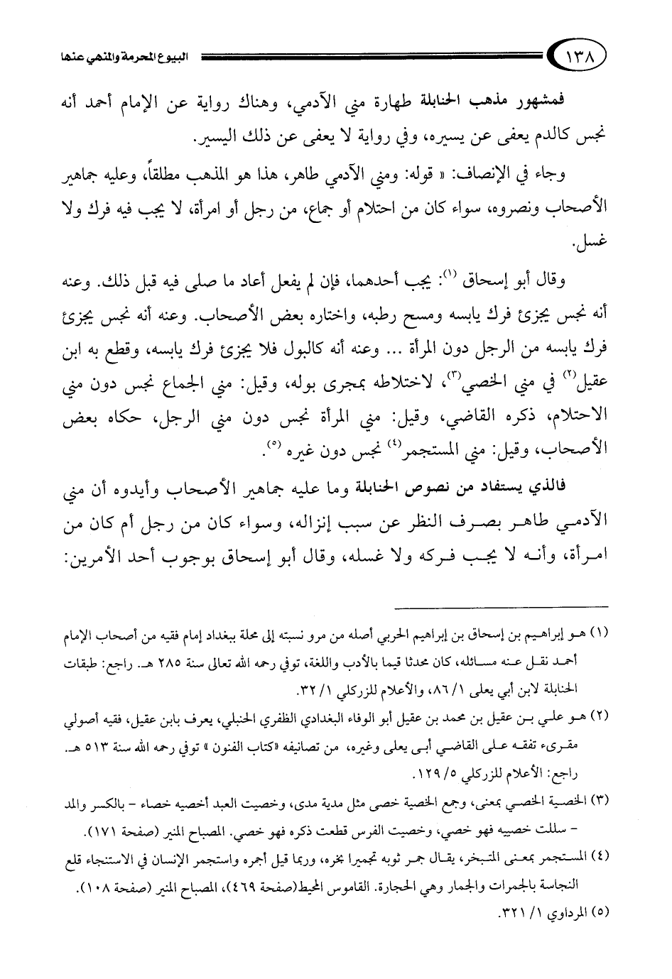 فالذي يستفاد من نصوص الحنابلة وما عليه جماهير الأصحاب وأيدوه أن مني الآدمي طاهر بصرف النظر عن سبب إنزاله، وسواء كان من رجل أم كان من امرأة، وأنه لا يجب فركه ولا غسله، وقال أبو إسحاق بوجوب أحد الأمرين: