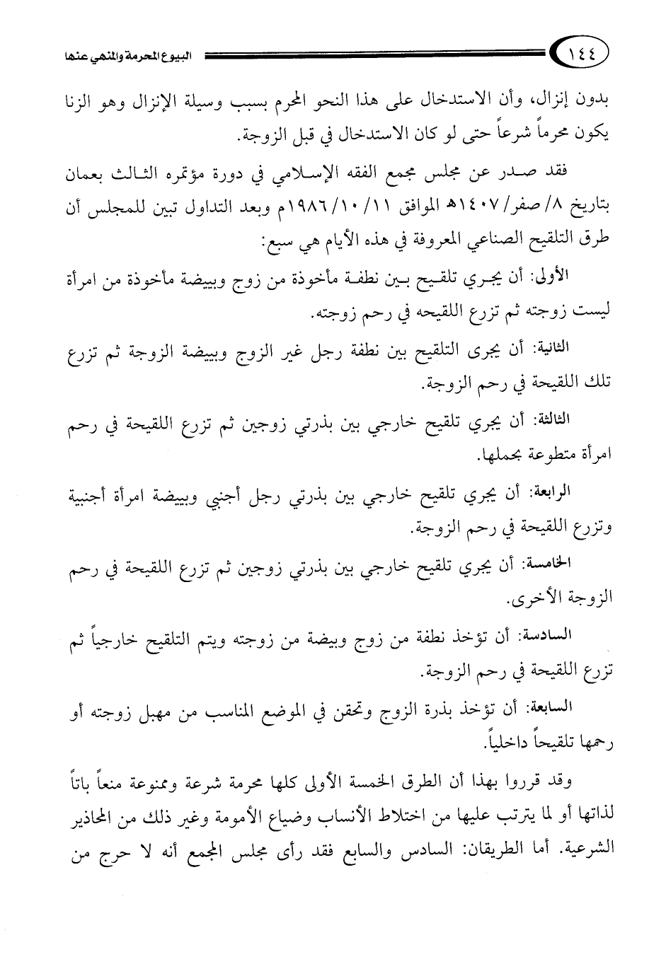 فقد صدر عن مجلس مجمع الفقه الإسلامي في دورة مؤتمره الثالث بعمان بتاريخ 8/صفر/1407? الموافق 11/10/1986م وبعد التداول تبين للمجلس أن طرق التلقيح الصناعي المعروفة في هذه الأيام هي سبع: