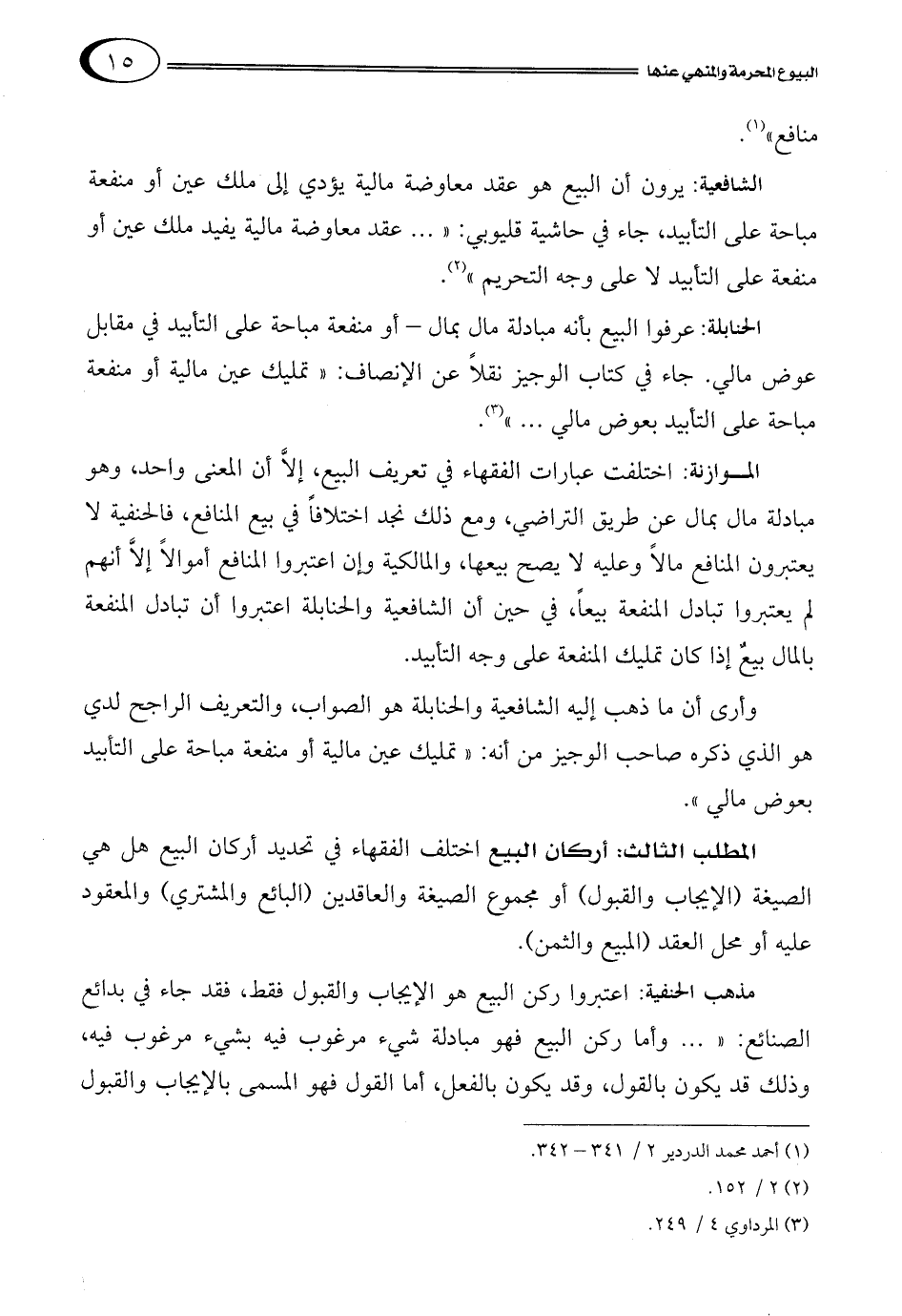 وأرى أن ما ذهب إليه الشافعية والحنابلة هو الصواب، والتعريف الراجح لدي هو الذي ذكره صاحب الوجيز من أنه: "تمليك عين مالية أو منفعة مباحة على التأبيد بعوض مالي".