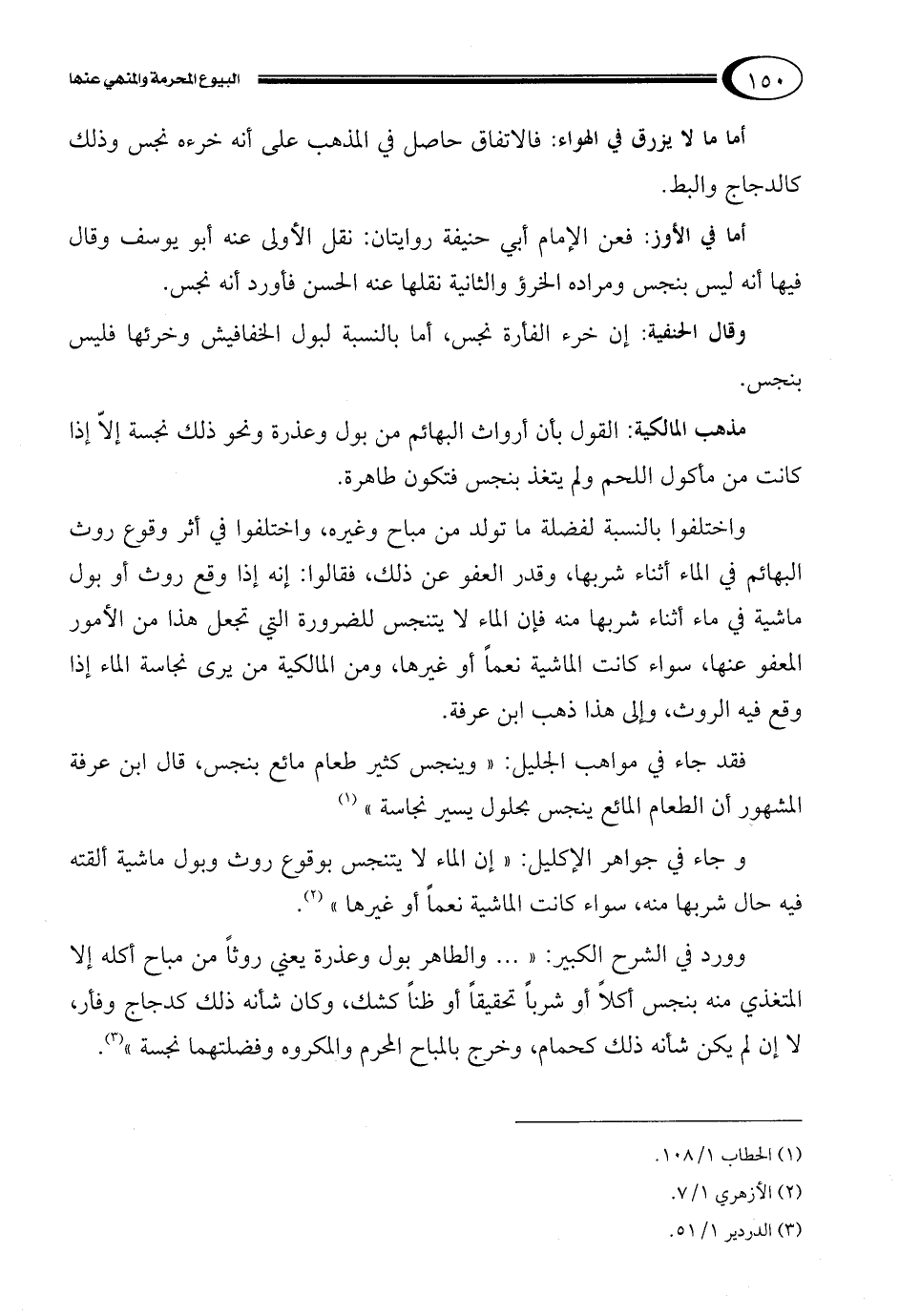 وجاء في جواهر الإكليل: "إن الماء لا يتنجس بوقوع روث وبول ماشية ألقته فيه حال شربها منه، سواء كانت الماشية نعماً أو غيرها"2.