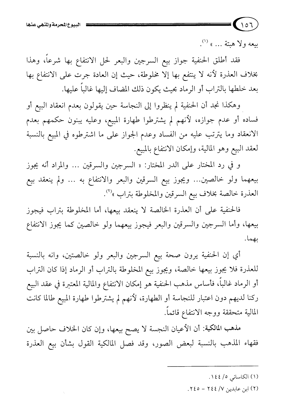 أي إن الحنفية يرون صحة بيع السرجين والبعر ولو خالصتين، وانه بالنسبة للعذرة فلا يجوز بيعها خالصة، ويجوز بيع المخلوطة بالتراب أو الرماد إذا كان التراب أو الرماد غالباً، فأساس مذهب الحنفية هو إمكان الانتفاع والمالية المعتبرة في عقد البيع ركنا لديهم دون اعتبار للنجاسة أو الطهارة، لأنهم لم يشترطوا طهارة المبيع طالما كانت المالية متحققة ووجه الانتفاع قائماً.