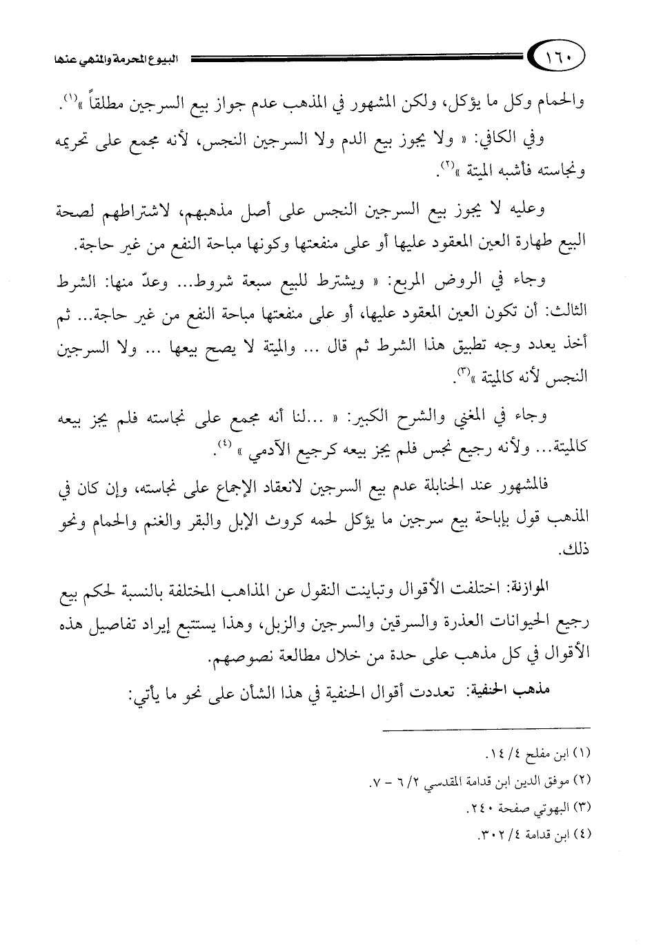 وجاء في الروض المربع: "ويشترط للبيع سبعة شروط ... وعدّ منها: الشرط الثالث: أن تكون العين المعقود عليها، أو على منفعتها مباحة النفع من غير حاجة ... ثم أخذ يعدد وجه تطبيق هذا الشرط ثم قال ... والميتة لا يصح بيعها ... ولا السرجين النجس لأنه كالميتة"3.