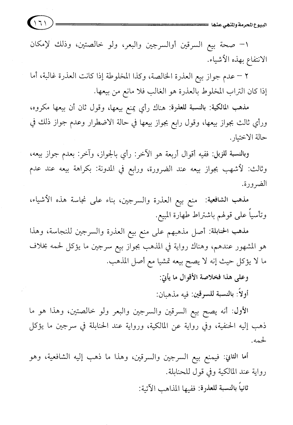 2 – عدم جواز بيع العذرة الخالصة، وكذا المخلوطة إذا كانت العذرة غالبة، أما إذا كان التراب المخلوط بالعذرة هو الغالب فلا مانع من بيعها.